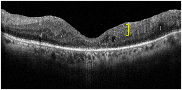 El espesor retinal fue determinado como la distancia entre la superficie interna de la retina, definida como la interfase entre el vítreo oscuro y el reflejo brilloso de la membrana limitante interna, y la superficie de la retina externa. 27