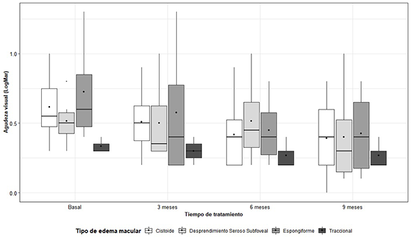 El comportamiento longitudinal de la AV de acuerdo a la escala LogMAR mostró un decremento significativo en función del tiempo para todos los tipos de edema, sin notables diferencias entre ellos. En un estudio realizado por Kim et al., la AV media varió entre los diferentes subgrupos de EMD, aunque sólo de manera significativa para el de tipo cistoideo, que se asoció a peores resultados visuales. 3