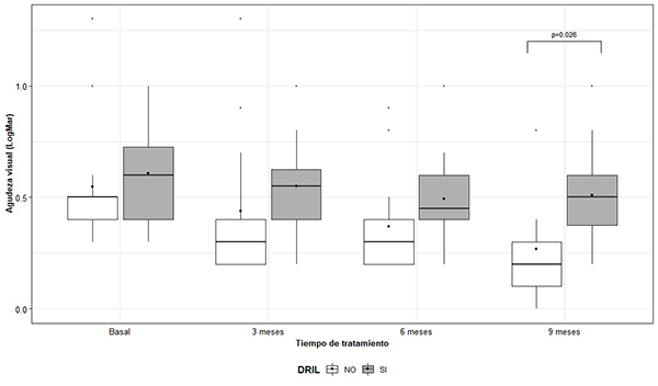 La agudeza visual media no resultó estadísticamente distinta según presencia o ausencia de DRIL en las tres primeras mediciones. Sin embargo, se encontró una diferencia significativa al comparar ambos grupos a los 9 meses (p=0.026), dado que los casos con presencia de DRIL mostraron un valor medio de LogMar mayor a aquellos con ausencia de DRIL (Figura 3).