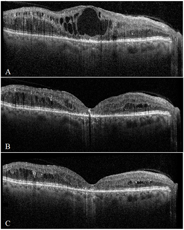Figura 4: Tomografía de Coherencia Óptica: signos en presencia de EMD. EMD cistoide con alteración en las capas de la retina externa y pobre ganancia de AV a pesar de una marcada reducción del EM a los nueve meses de tratamiento. AVMC: A) Línea de base: LogMAR 0,9 (Eq. Snellen: 20/160); B) Mes 3: LogMAR 0,7 (Eq. Snellen: 20/100); C) Mes 6: LogMAR 0,7 (Eq. Snellen: 20/100).