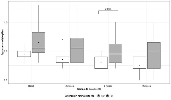 La agudeza visual media resultó estadísticamente diferente entre los casos con alteración de la retina externa y los casos sin ésta, cuando se midió a los 6 meses de tratamiento (p=0.035). (Fig. 4). No se encontraron diferencias significativas en los otros momentos de medición (Fig. 5). Al analizar el comportamiento de la agudeza visual, según escala LogMar, en forma longitudinal, se encontró que la misma presentó un decrecimiento estadísticamente significativo en función del tiempo de tratamiento (p < 0.001), sin diferir de acuerdo la presencia o ausencia de alteraciones en la retina externa (efecto interacción: p=0.912) (Tabla 1).