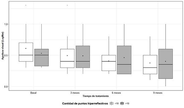 Figura 6: Distribución de AV (LogMar) de acuerdo al tiempo de medición y al número de puntos hiperreflectivos.