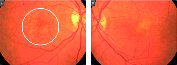 Figura 1. Fondo de ojo derecho e izquierdo. A) Presencia de múltiples drusen de tamaño intermedio en la región central. B) Lesión tipo desprendimiento drusenoide del EPR.
