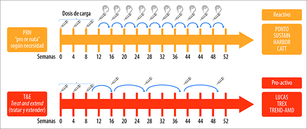 El estudio PRONTO7 (Prospective Optical Coherence Tomography Imaging of Patients with Neovascular AMD Treated with intra-Ocular Ranibizumab), prospectivo, monocéntrico a 2 años, realizado en 40 pacientes, demostró que se podía guiar el tratamiento mediante la agudeza visual y el OCT. Los participantes lograron mantener buenas agudezas visuales, aunque no fueron tratados de manera fija. Si bien este estudio es de bajo nivel de evidencia, fue importante para seguir explorando esta estrategia. Los estudios CATT, IVAN, SUSTAIN y HARBOR mostraron agudezas visuales no inferiores al tratamiento fijo a los 12 y 24 meses con ranibizumab realizando un menor número de inyecciones5-6, 8-9. Estos resultados reforzaron la idea del tratamiento monitoreado por signos de actividad de la enfermedad y la personalización del esquema de tratamiento. Si bien el régimen PRN disminuía la cantidad de inyecciones, requería de visitas muy frecuentes; esto redunda en una falta de adherencia al tratamiento y por consiguiente una gran pérdida de efectividad10-11. Por otra parte, la aplicación de la medicación está supeditada a la presencia de fluido en la retina y múltiples estudios demostraron que esa acumulación sería responsable -entre otras causas- del deterioro progresivo de la agudeza visual12. Sería más adecuado un esquema de tratamiento que reduzca la cantidad de inyecciones, el número de visitas y que no tolere la acumulación de fluido.