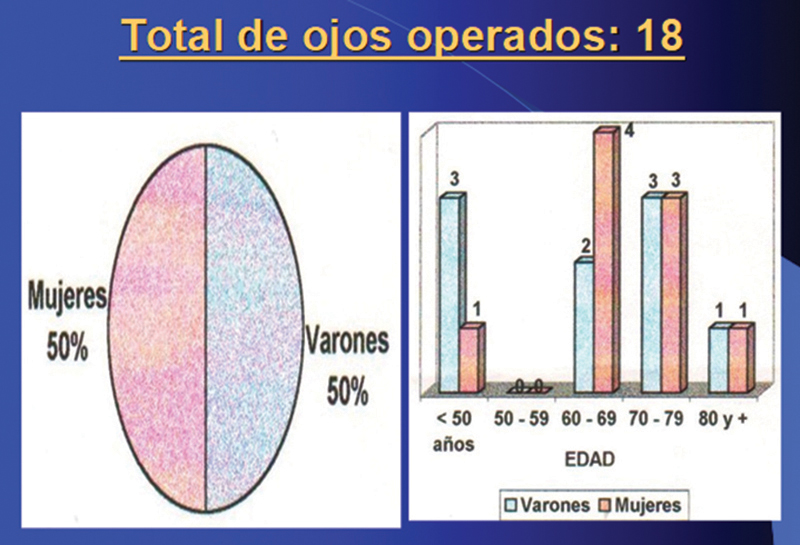Se incluyeron 18 ojos de 18 pacientes con: quemaduras de córnea por cal (n=2); queratopatías bullosas pseudofáquicas y afáquicas (n=3); Penfigoides oculares (n=2); queratopatías post-queratoplastia penetrante (n=4); úlceras de córnea a repetición en queratitis metaherpéticas y postinfecciosas (n=2); y pterigión invasor recidivante (n=4) y un caso con degenaración grasa de la córnea. Actualmente, tenemos 41 casos operados con injerto de membrana amniótica.