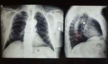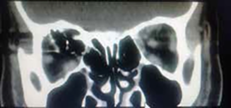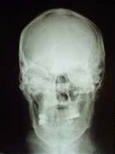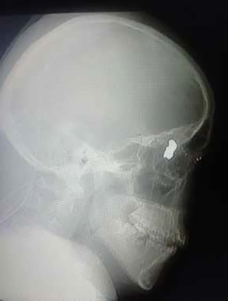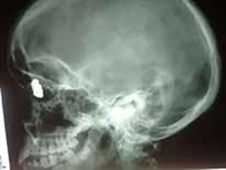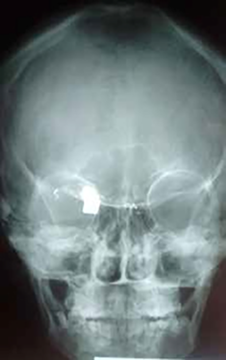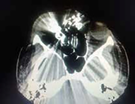 Se solicitaron Rx de cráneo frente perfil, MNP y FNP y tomografía computada, constatándose la presencia de proyectil en ángulo supero-interno de órbita y esquirlas diseminadas. En su pasaje desde su ingreso en la cara anterolateral izquierda y superior de la pirámide nasal el proyectil se fue fragmentando dejando partículas plúmbicas diseminadas. No habiendo signos infecciosos se discontinúa el antibiótico y se mantiene el antiinflamatorio (Figuras 2 y 3).