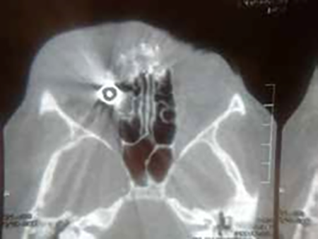 El martes 17 de diciembre de 2019, se intenta extraer el proyectil por vía transconjuntival, pero dado lo difícil del acceso y a ciegas, y ante el temor de dañar el paquete etmoidal anterior, se desiste del objetivo, sutura de conjuntiva con Vicryl 7.0. Se conversa con la familia, la cual decide no realizar otra cirugía por vía transcutánea.