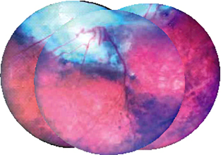 28/7/19: Se reexamina, ya puede verse al fondo claramente observando las lesiones de las fotografías inferiores: ruptura coriorretinal traumática en OD (Figura 4).