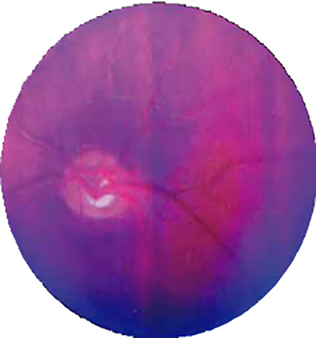 • Fondo de ojo: OD se observa área de movilización pigmentaria en el polo posterior y velo fibrótico nasal a la papila que se observa. Papila atrófica (Figuras 8 y 9).