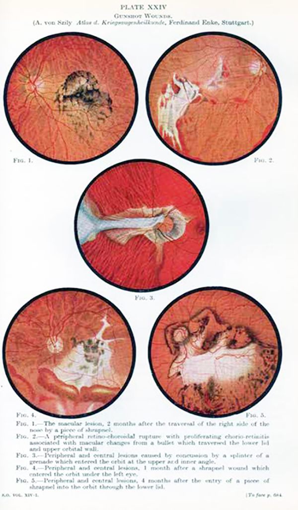 21. Von Szily, Aurel: Atlas der Kriegsaugenheilkunde. (Atlas de oftalmología de Guerra) Stuttgart, Ferdinand Enke, 1917, Pg. 254 (Citado por Richards, West y Meisels).